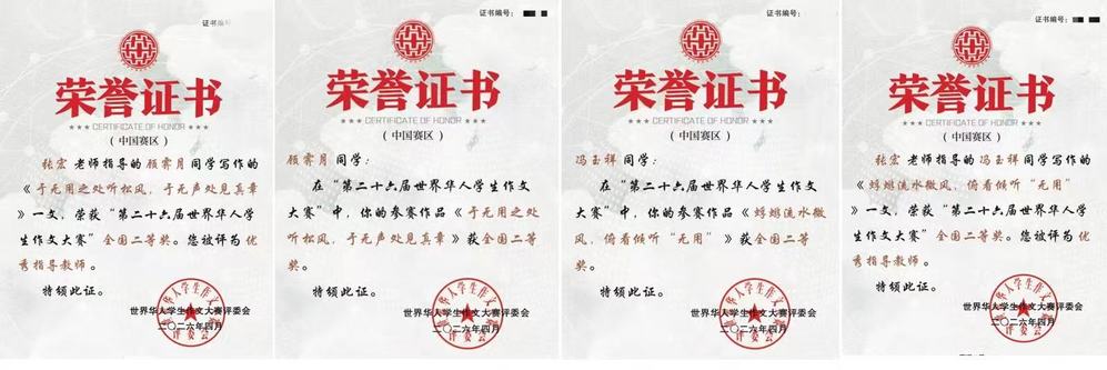 世界华人学生作文大赛由中华全国归国华侨联合会、中华全国台湾同胞联谊会等单位共同主办,是教育部白名单中唯一面向全球华人的作文赛事。大赛的宗旨在于“弘扬中华文化,厚植家国情怀,促进海内外华人青少年交流,提升人文素养与写作能力”。正因如此,它不仅是写作能力的竞技场,更是检验华人青少年文化认同与家国情怀的试金石。本届大赛评审严格、含金量高,全国二等奖获奖比例极低,殊为不易。